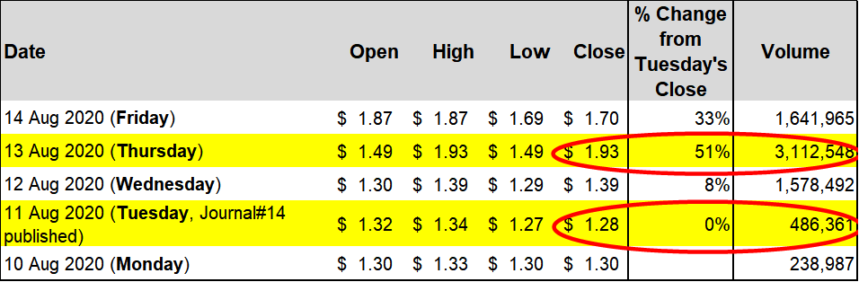 Thursday’s sudden surge in price goes to show, when an investment gem gets noticed by Mr. Market the stock price can really rocket. A graph and table of Navigator’s price movements last week is reproduced below.